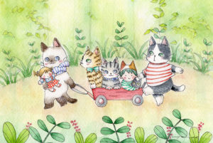 作品をみた人がおもわず微笑んでしまうような優しい絵を目指して、ねこや子どもたちを中心に、動物たちの楽しい世界をペンと水彩で描いています。