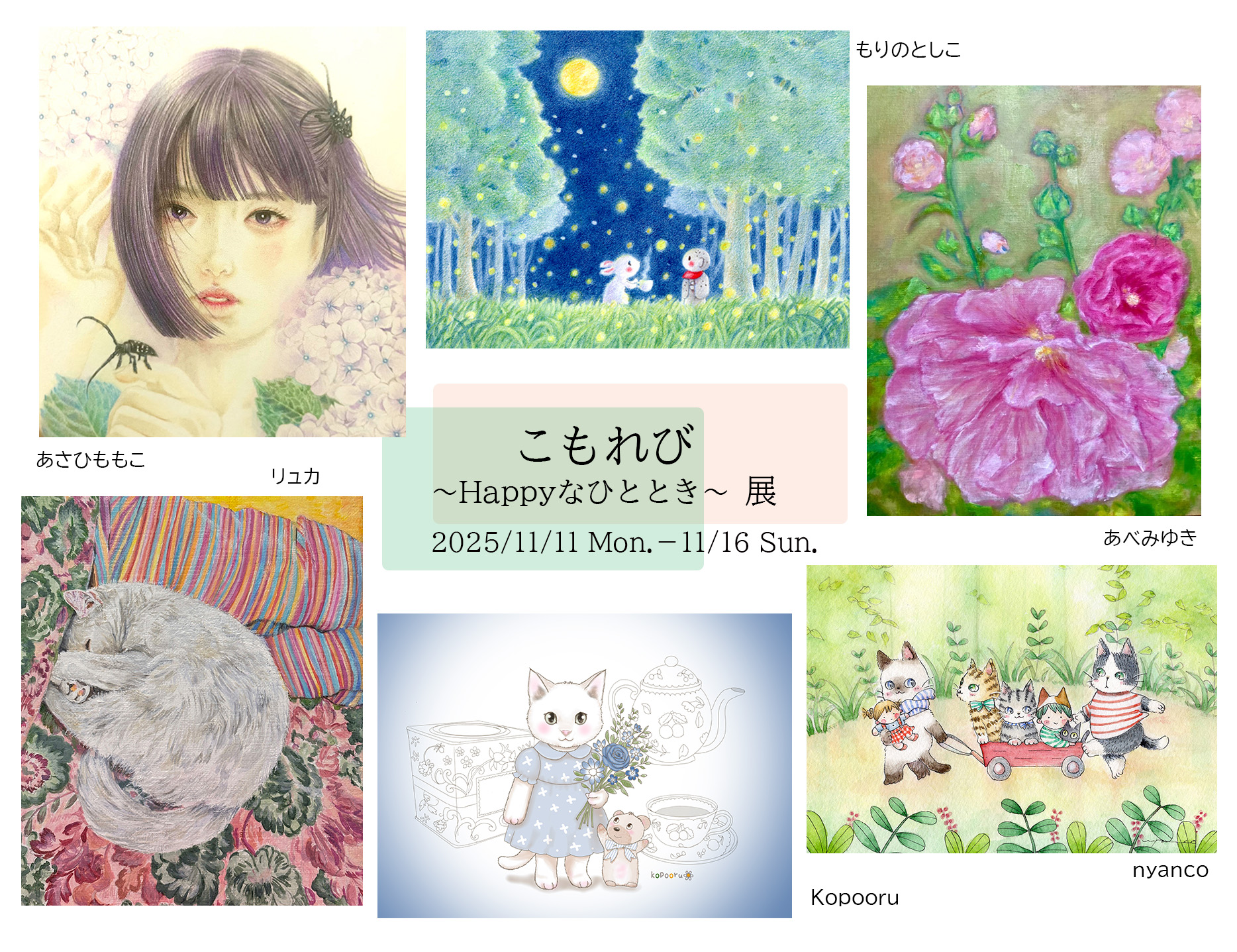 木漏れ日のような柔らかな光と温もりを感じるアートと癒しの空間。6人の個性豊かなアーティストが、それぞれの視点で「Happyなひととき」を描いた作品を展示します。